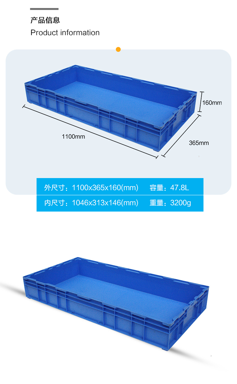外尺寸:1100*365*160mm 內(nèi)尺寸:1046*303*146mm 材質(zhì):PP 重量:3200g