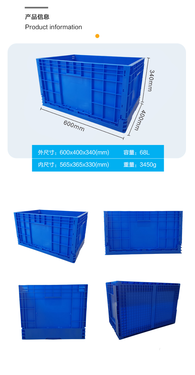 外尺寸:600*400*340mm 內(nèi)尺寸:565*365*330mm 材質(zhì):PP 重量:3450g