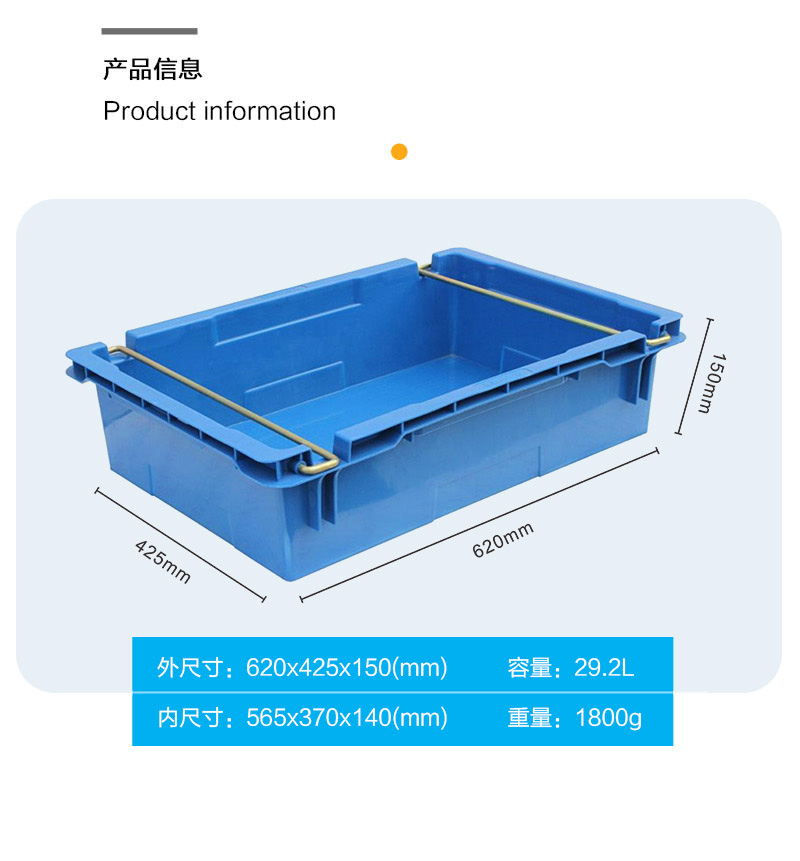 外尺寸:620*425*150mm 內(nèi)尺寸:565*370*140mm 材質(zhì):PP 重量:1800g