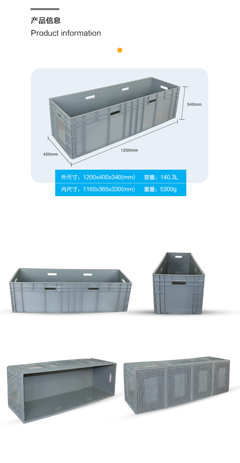 外尺寸:1200*400*340mm 內尺寸:1165*365*330mm 材質:PP 重量:5300g