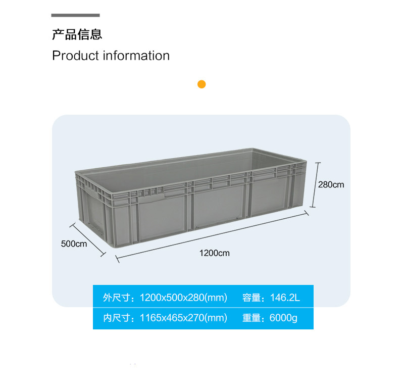 外尺寸:1200*500*280mm 內(nèi)尺寸:1165*465*270mm 材質(zhì):PP 重量:6000g