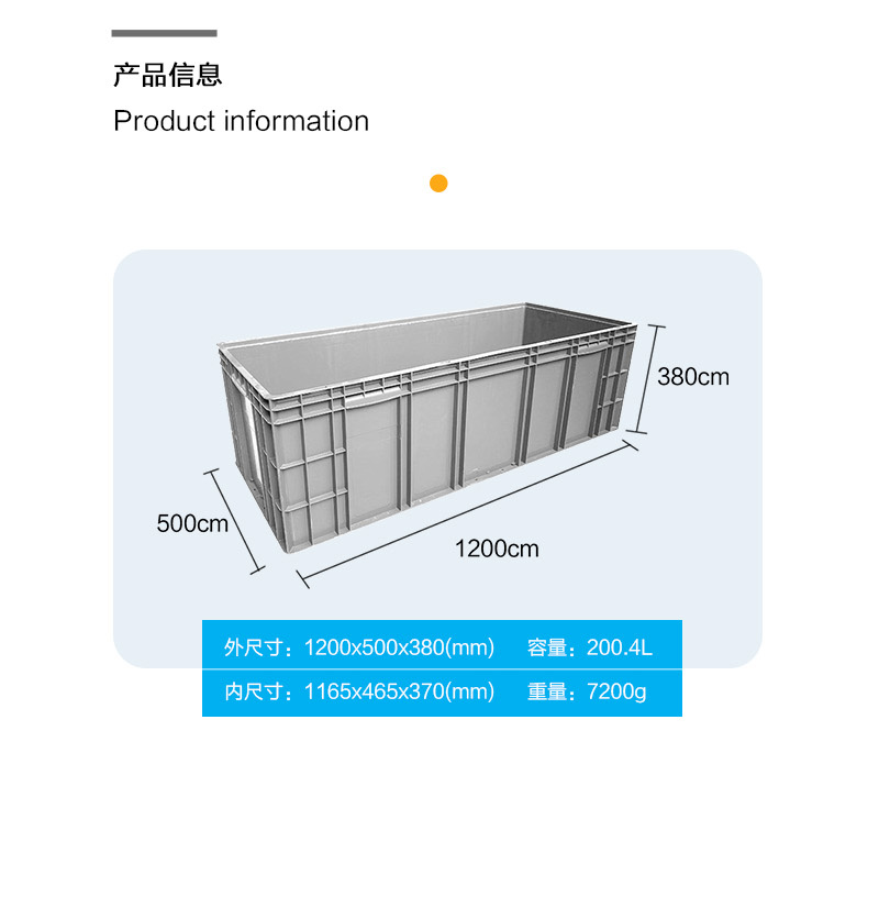 外尺寸:1200*500*380mm 內(nèi)尺寸:1165*465*370mm 材質(zhì):PP 重量:7200g