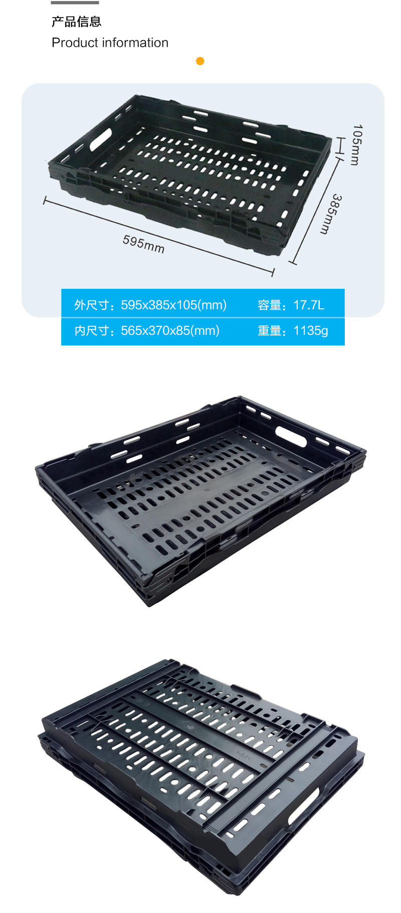 外尺寸:595*385*105mm 內(nèi)尺寸:565*370*85mm 材質(zhì):PP 重量:1135g