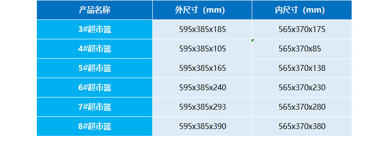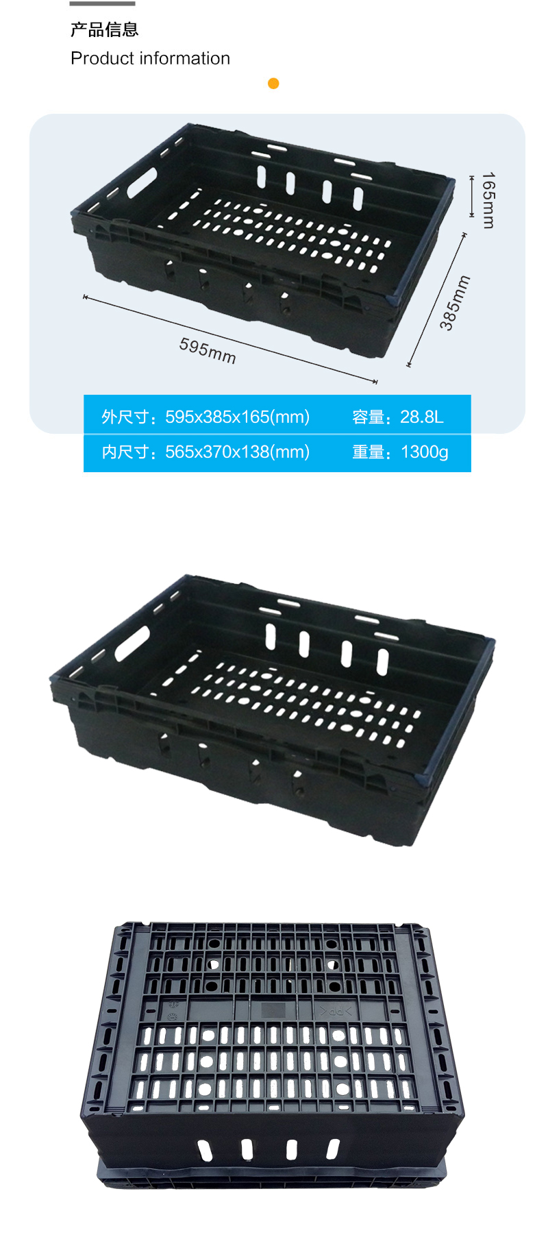 外尺寸:595*385*165mm 內(nèi)尺寸:565*370*138mm 材質(zhì):PP 重量:1300g