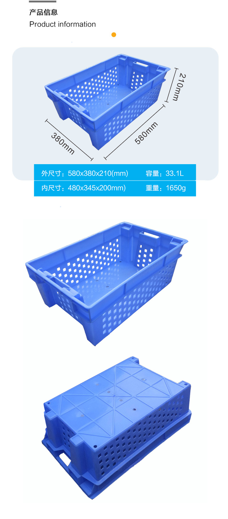 外尺寸:580*380*210mm 內(nèi)尺寸:480*345*200mm 材質(zhì):PP 重量:1650g