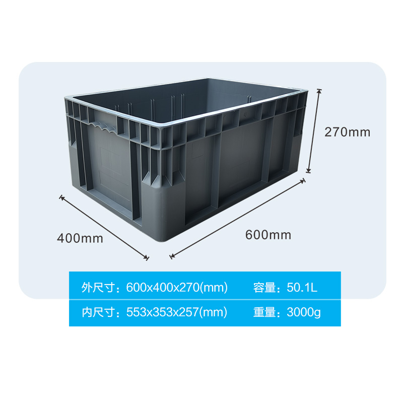 外尺寸:600*400*270mm 內(nèi)尺寸:553*353*257mm 材質(zhì):PP 重量:3000g