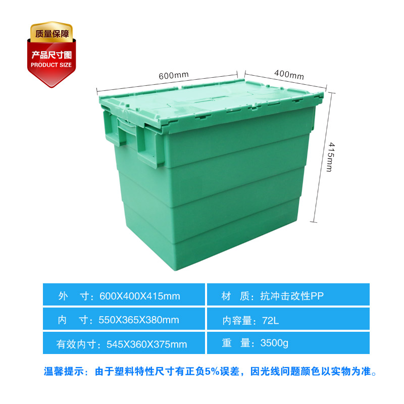 外尺寸:600×400×415mm 內(nèi)尺寸:550×365×380mm 材質(zhì):PP 重量:3500g