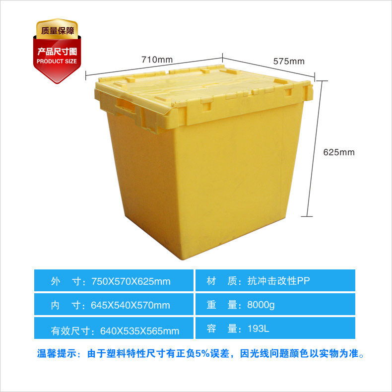 外尺寸:710×575×625mm 內(nèi)尺寸:645×540×570mm 材質(zhì):PP 重量:4500g