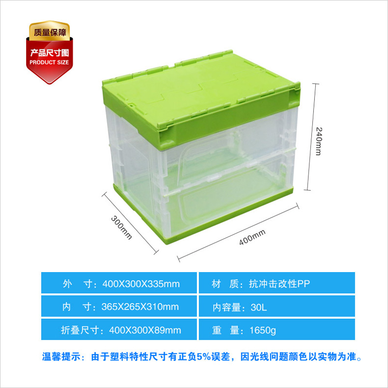 外尺寸:400×300×335mm 內(nèi)尺寸:365×265×310mm 材質(zhì):PP 重量:1950g