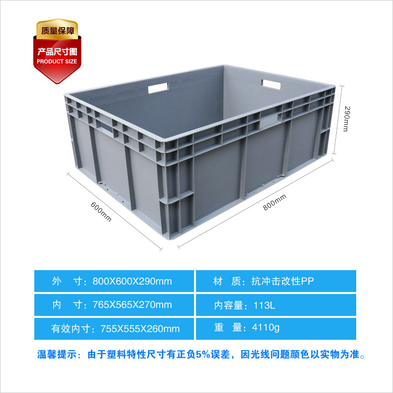 外尺寸:800*600*290mm 內尺寸:765*565*280mm 材質:PP 重量:4110g