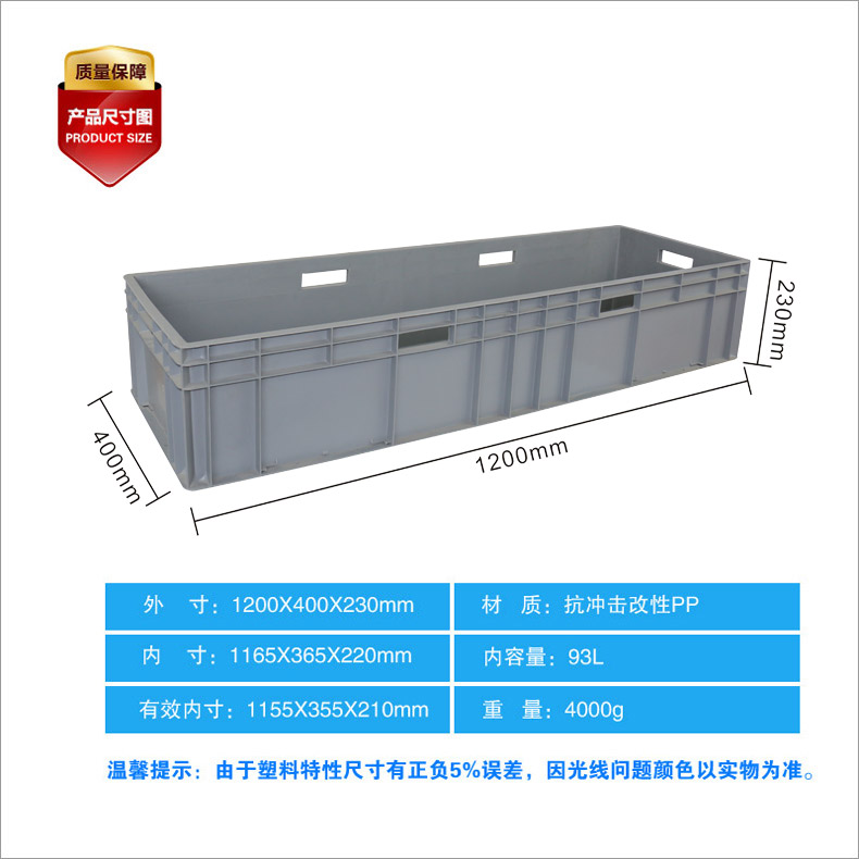 外尺寸:1200*400*230mm 內尺寸:1165*365*210mm 材質:PP 重量:3960g
