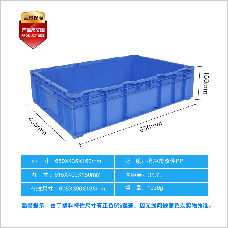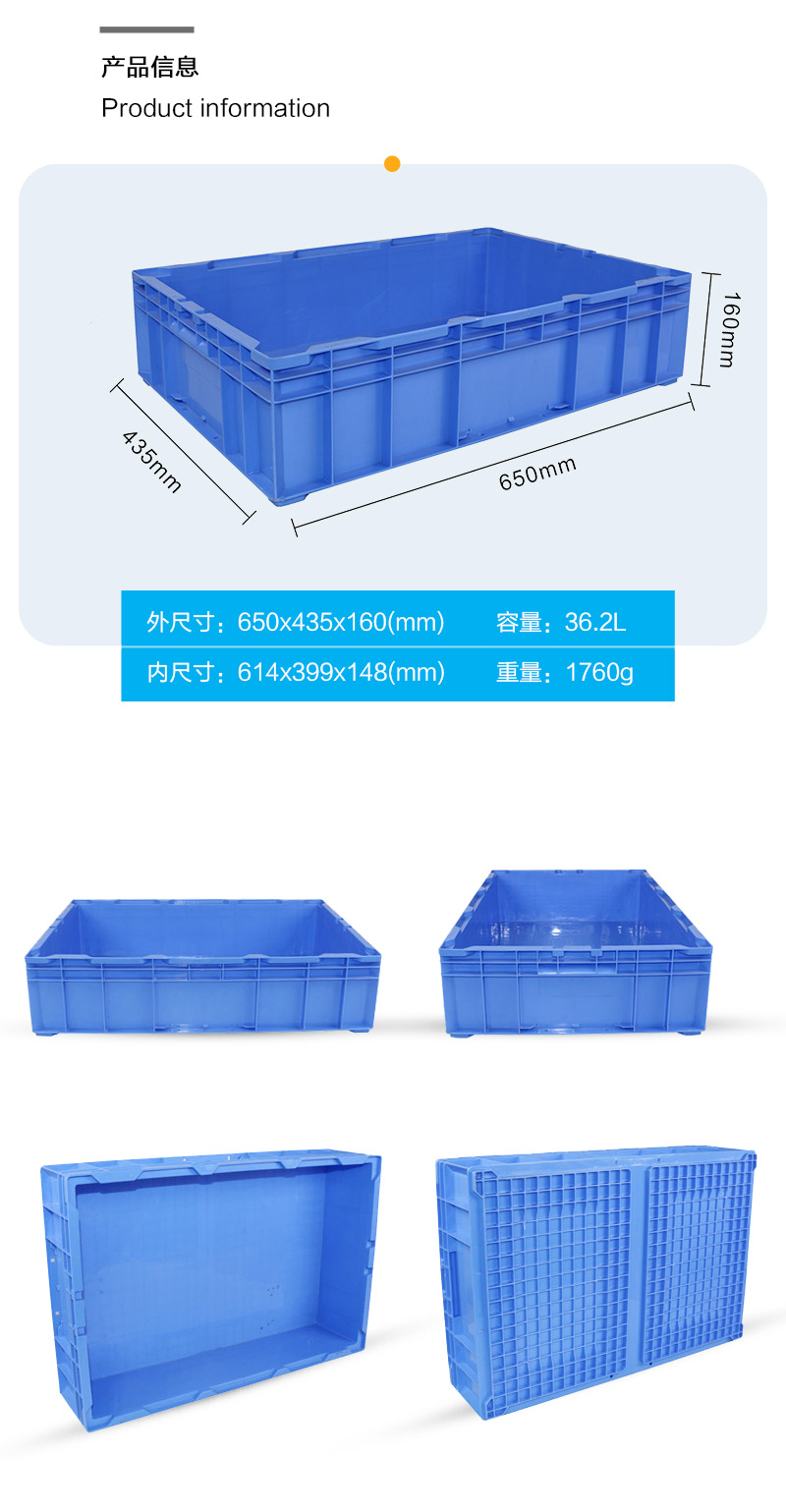 外尺寸:650*435*160mm 內(nèi)尺寸:614*299*148mm 材質(zhì):PP 重量:1760g