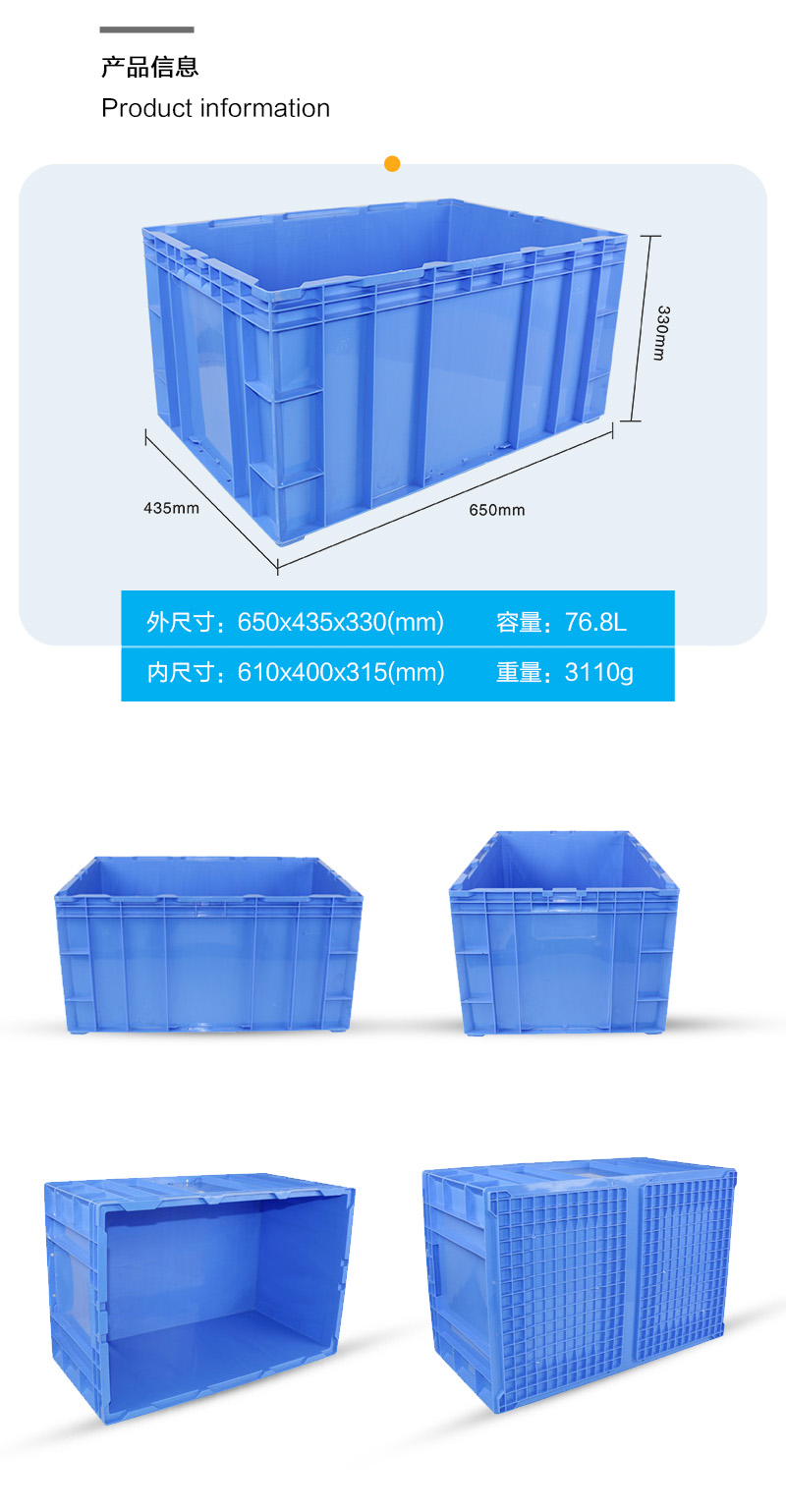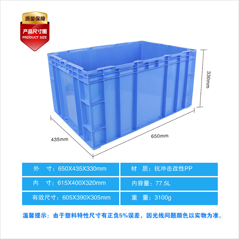 外尺寸:650*435*330mm 內(nèi)尺寸:614*399*315mm 材質(zhì):PP 重量:3100g