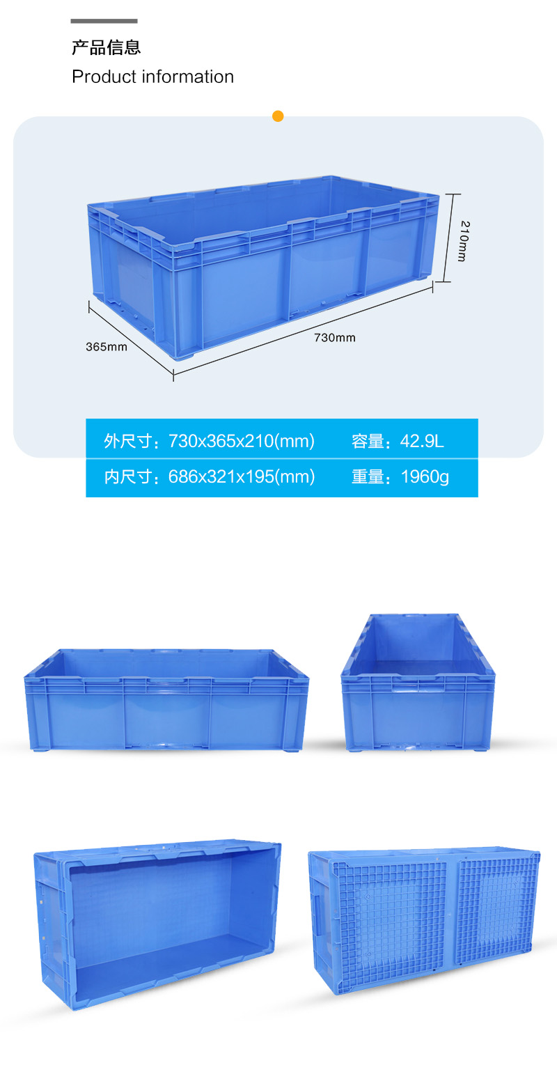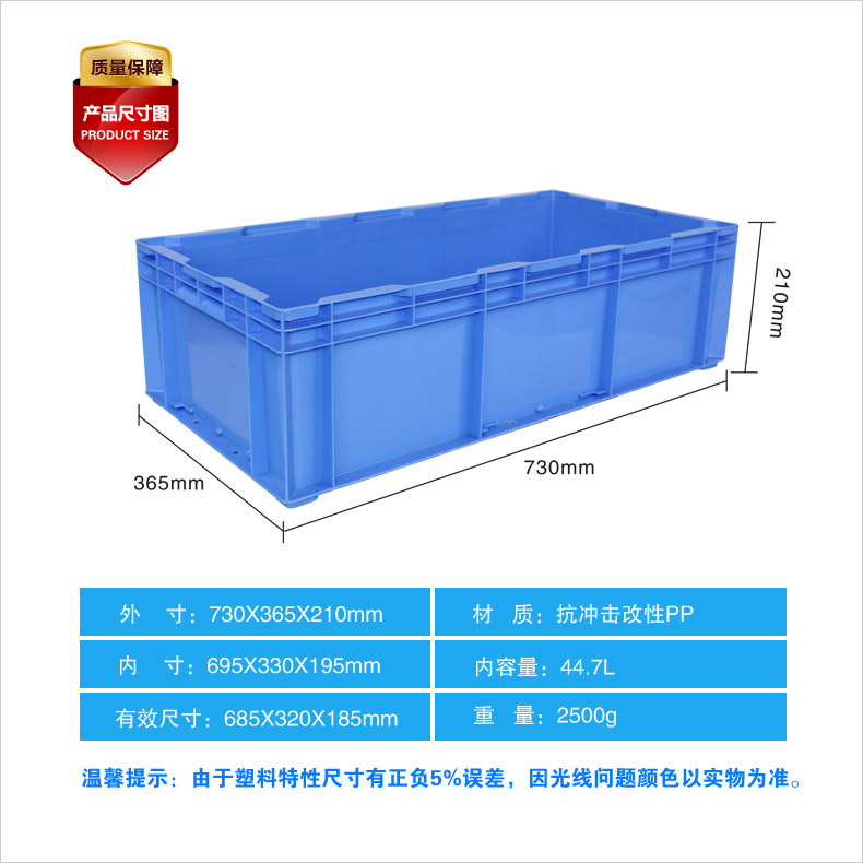 外尺寸:730*365*210mm 內(nèi)尺寸:649*321*195mm 材質(zhì):PP 重量:1960g