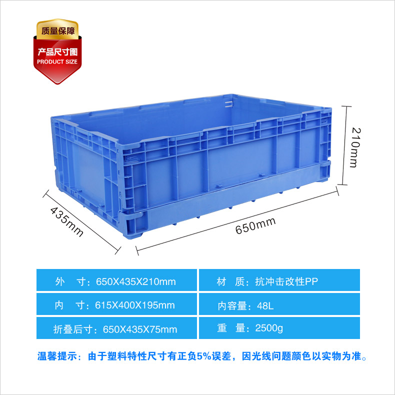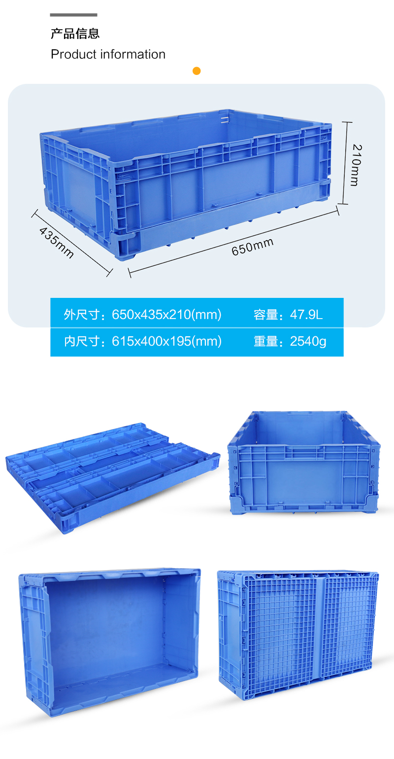 外尺寸:650*435*210mm 內(nèi)尺寸:615*400*195mm 材質(zhì):抗沖擊改性PP 重量:1850g