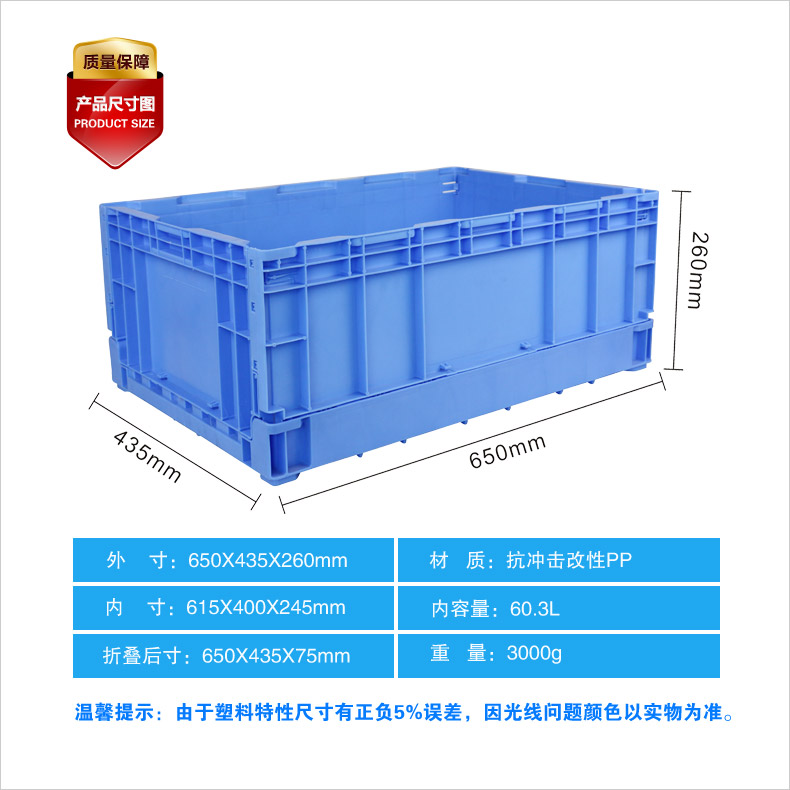 外尺寸:650*435*260mm 內(nèi)尺寸:615*400*245mm 材質(zhì):抗沖擊改性PP 重量:2650g