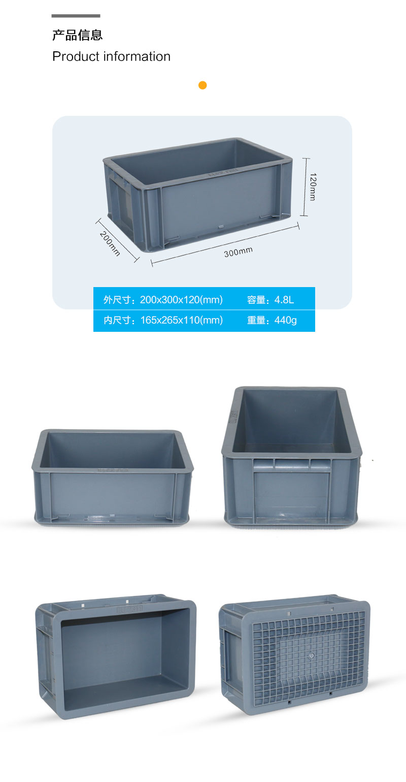 外尺寸:200*300*120mm 內(nèi)尺寸:165*265*110mm 材質(zhì):抗沖擊改性PP 重量:455g