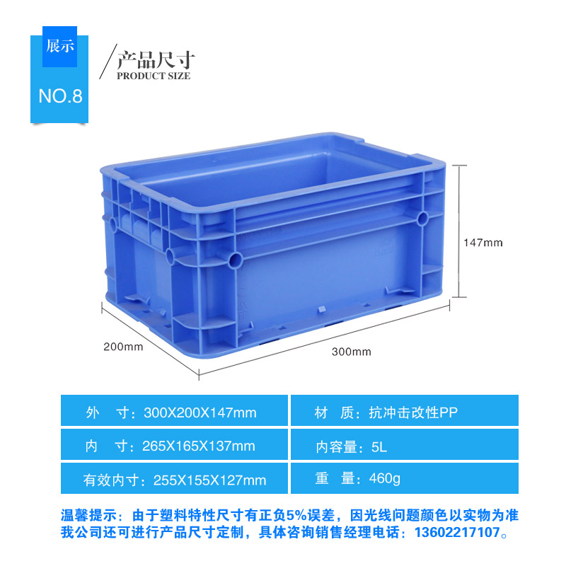 外尺寸:300×200×147mm 內(nèi)尺寸:255×155×130mm 材質(zhì):抗沖擊改性PP 重量:530g
