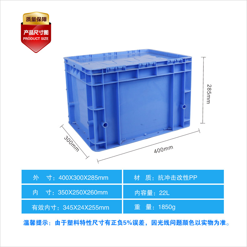 外尺寸:400×300×280mm 內(nèi)尺寸:350×250×260mm 材質(zhì):抗沖擊改性PP 重量:1520g
