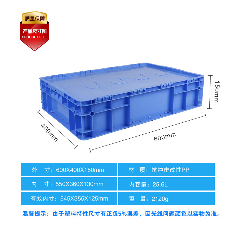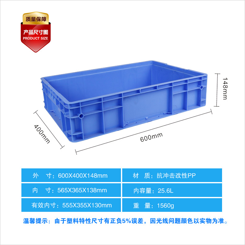 外尺寸:600×400×147mm 內(nèi)尺寸:550×360×130mm 材質(zhì):抗沖擊改性PP 重量:1560g