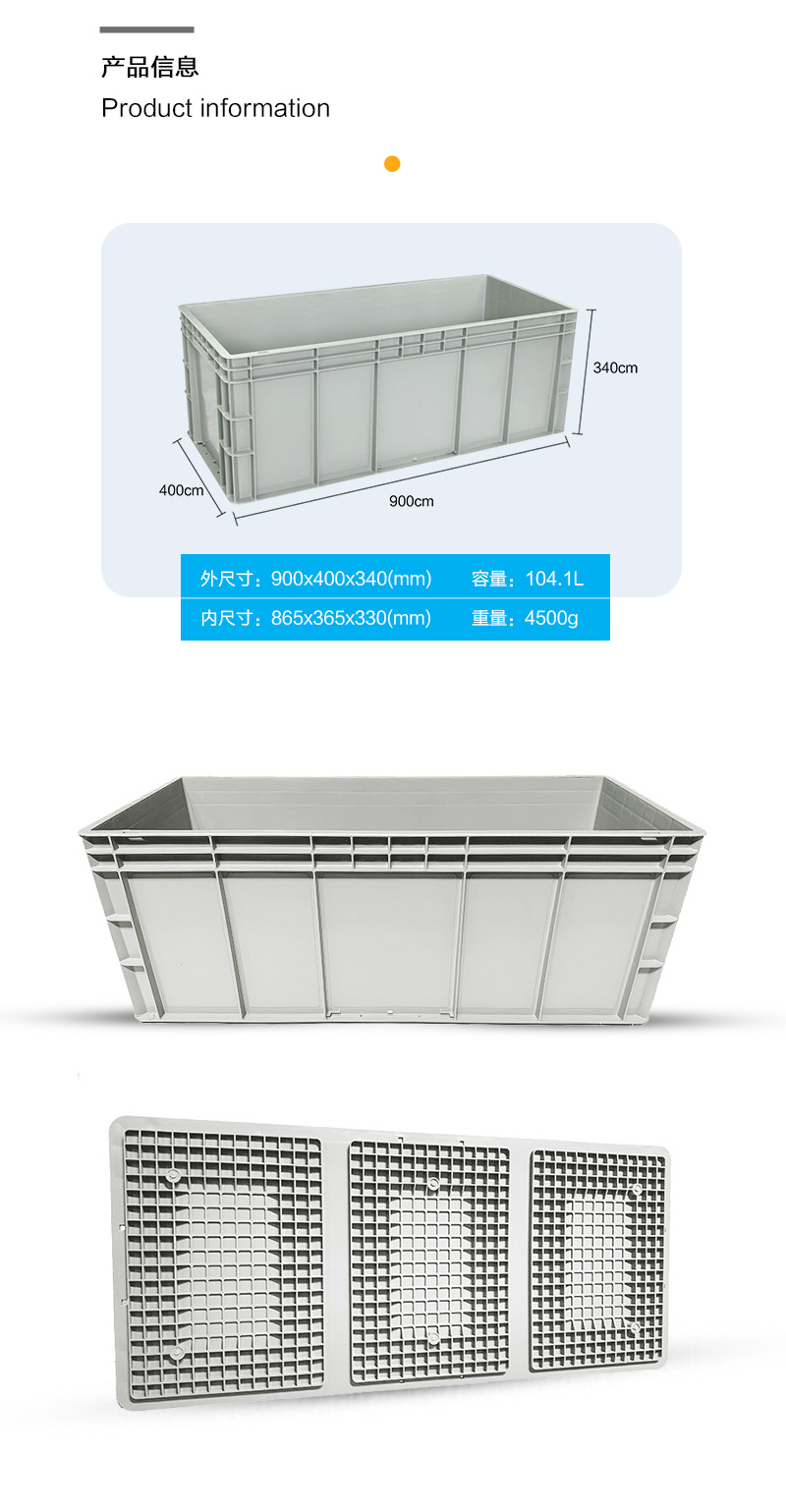 外尺寸:900*400*340mm 內(nèi)尺寸:865*365*330mm 材質(zhì):抗沖擊性改性PP 重量:4300g