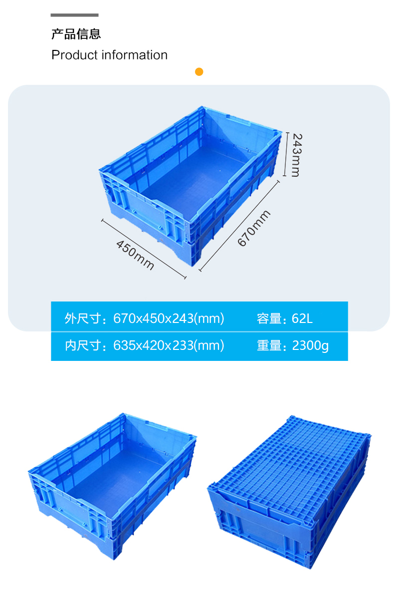 外尺寸:670*450*243mm 內(nèi)尺寸:635*415*233mm 材質(zhì):PP 重量:2300