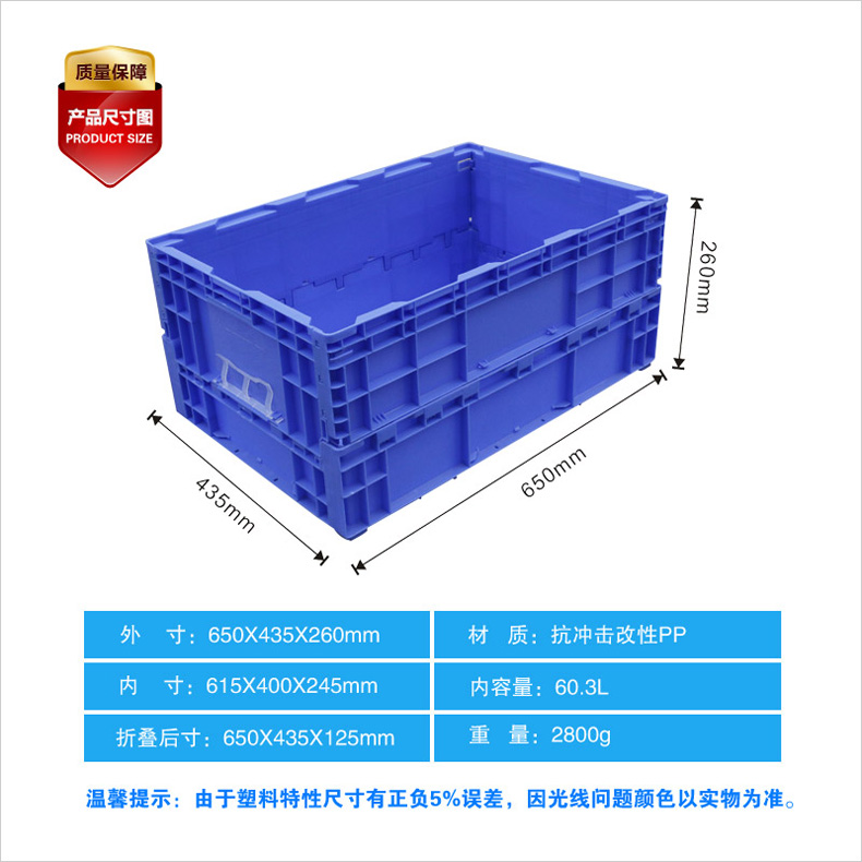 外尺寸:650*435*260mm 內(nèi)尺寸:615*400*245mm 材質(zhì):抗沖擊改性PP 重量:2980g