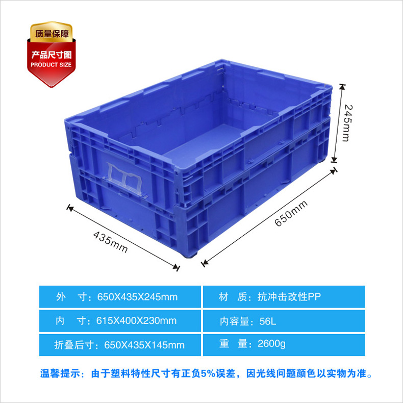 外尺寸:650*435*245mm 內(nèi)尺寸:610*400*225mm 材質(zhì):抗沖擊改性PP 重量:2600g