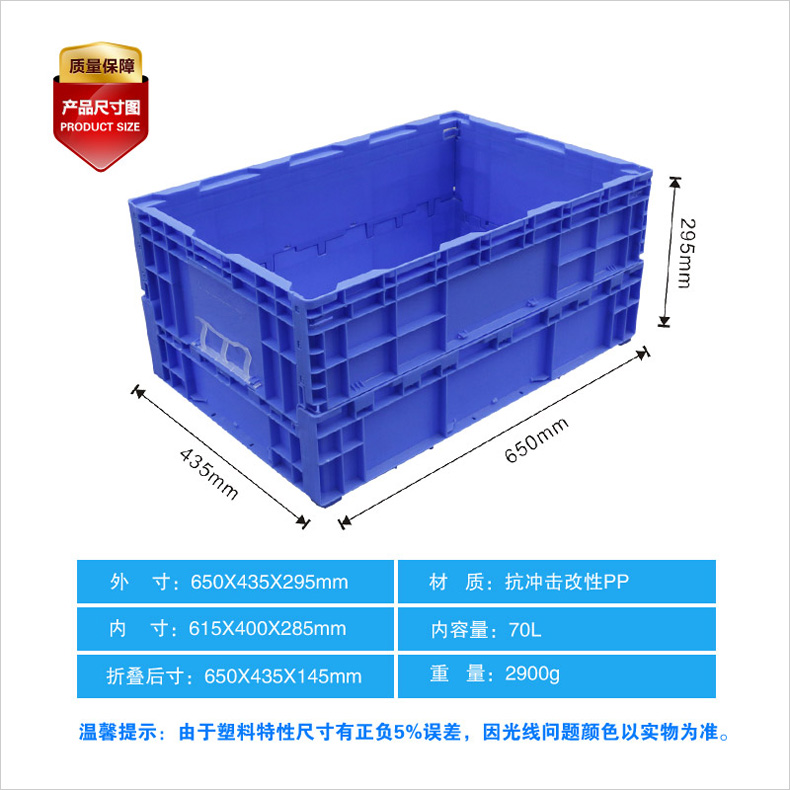 外尺寸:650*435*295mm 內(nèi)尺寸:610*400*285mm 材質(zhì):抗沖擊改性PP 重量:2900g