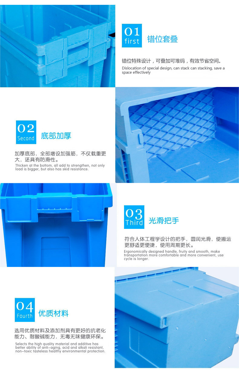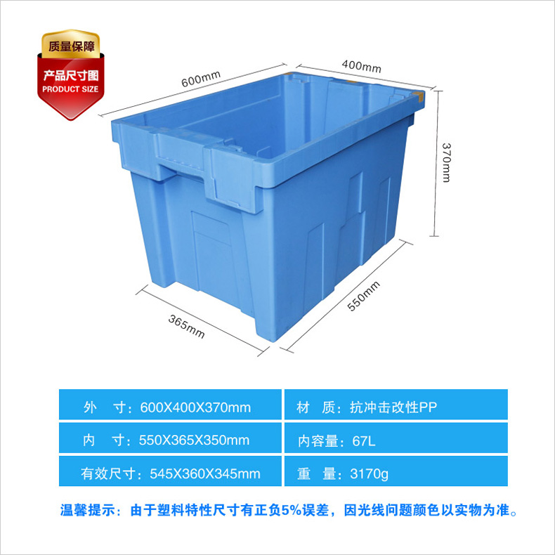 外尺寸:600*400*370mm 內(nèi)尺寸:440*320*355mm 材質(zhì):抗沖擊改性PP 重量:3170g