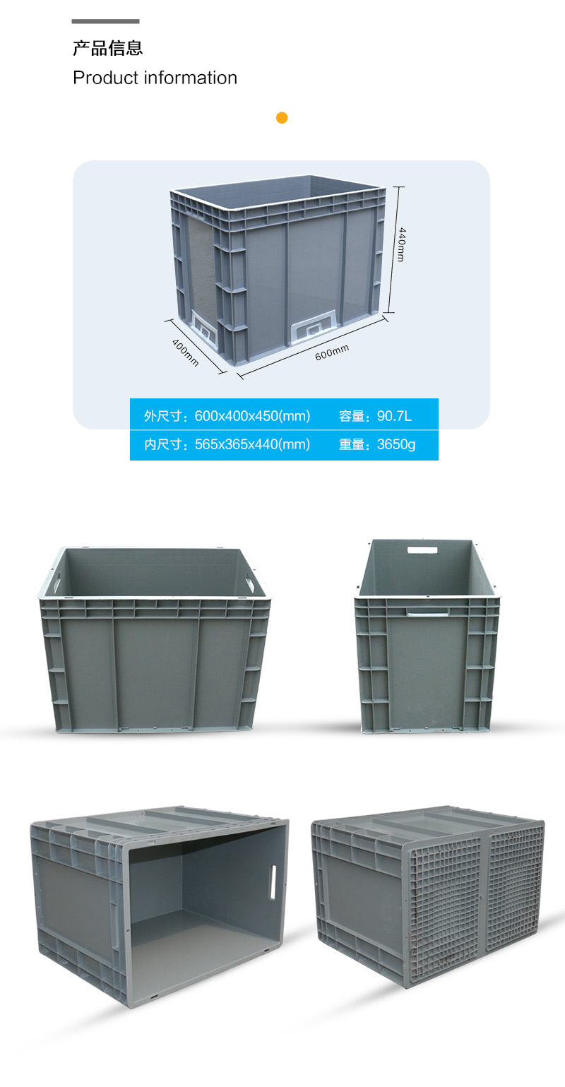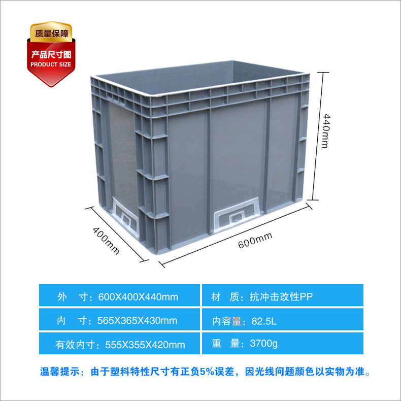 外尺寸:600X400X440mm 內(nèi)尺寸:565X365X430mm 材質(zhì):抗沖擊改性PP 重量:3.6kg