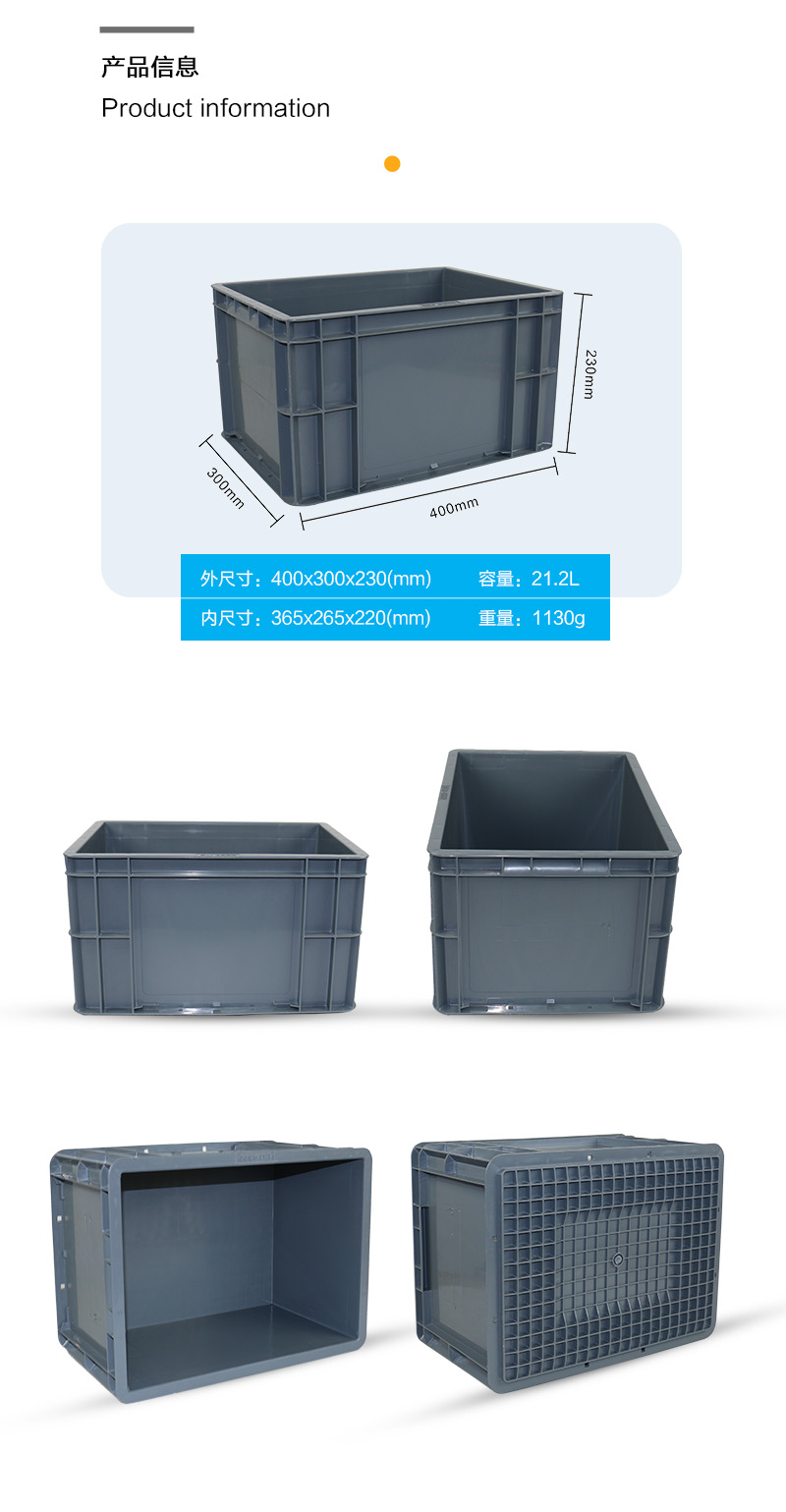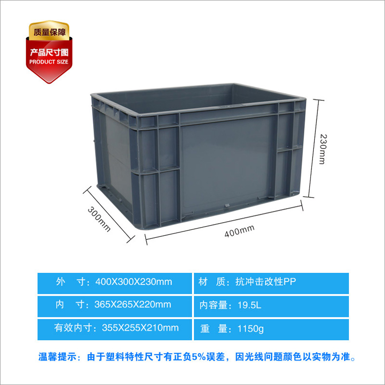 外尺寸:400X300X230mm 內(nèi)尺寸:465X265X220mm 材質(zhì):抗沖擊改性PP 重量:1.1kg